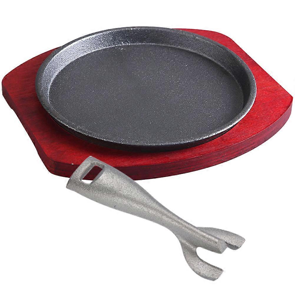 1 Set of Iron Steak Plate with Wooden Base Non Stick Fried Pan Grill Serving Plate