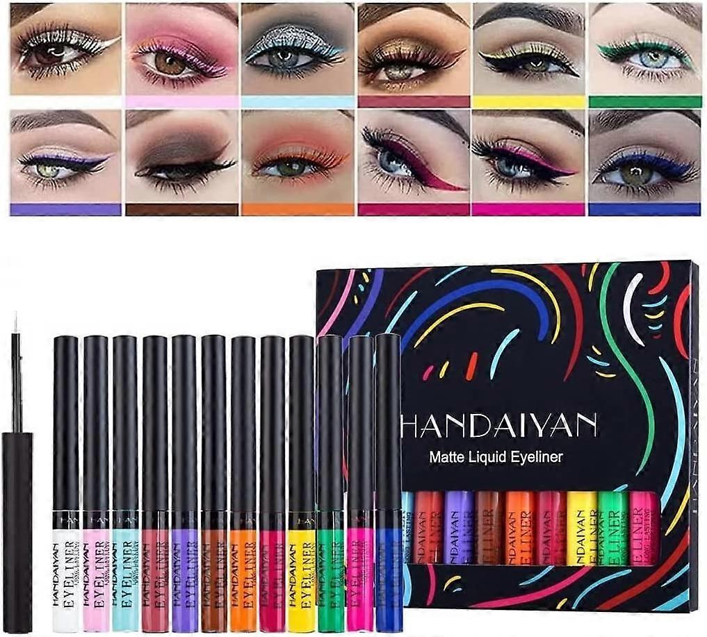 VIBRANT COLOURS EYELINER SET: (12 shades of matte) - White(matte), Pink(matte), Light Blue(matte), Dark Red(matte), Purple(matte), Brown(matte), Orange (matte),Red(matte), Yellow(matte), Green(matte), Rose(matte), Blue(matte) VIVID BRIGHT MATTE EYELINER PENS: The waterproof creamy gel eyeliner set is available in 12 matte rainbow colours, quickly dry, waterproof, highly pigmented formula, easy to apply and pigmented, natural and vegan formula that be glides on smoothly, high precision tip that draws a sharp line, intense colouring. WATERPROOF & SMUDGEPROOF GEL EYE LINERS: Highly pigmented formula and quick drying, no fading, water tight, sweat proof, no smudge. Does not go away with tears, eye drops, water, sweat resistant, smudge-proof, and its long-wear formula means it really does stick without sliding or flaking until you wash it off. That stays all day wear perfectly. PERFECT GIFT FOR GIRLFRIEND/WIFE/WOMEN: 12 colours rainbow colourful brighten pigments liquid eyeliners are ideal for party, cosmetic show, live show, prom night, dance party, wedding makeup and daily makeup, making you be the eye-catcher in every occasion. With unique package, it would be the perfect gift to your girlfriend, bestie, wife, lover. EASY TO REMOVE: Easily to remove eyeliner with warm water or makeup remover, fast and clean, never worry about pigmentation. TIPS: Please do not blink eyes immediately after use, wait 2-3 minutes for it to dry, and then the colored liner will lasts all day wearing.