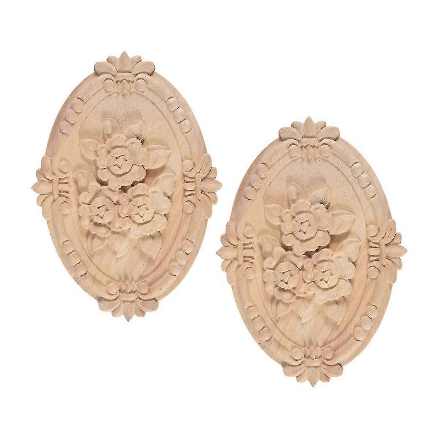 2Pcs Wood Carved Applique Frame Onlay Unpainted Furniture Decoration Unpainted Oval Patterns 21X15cm