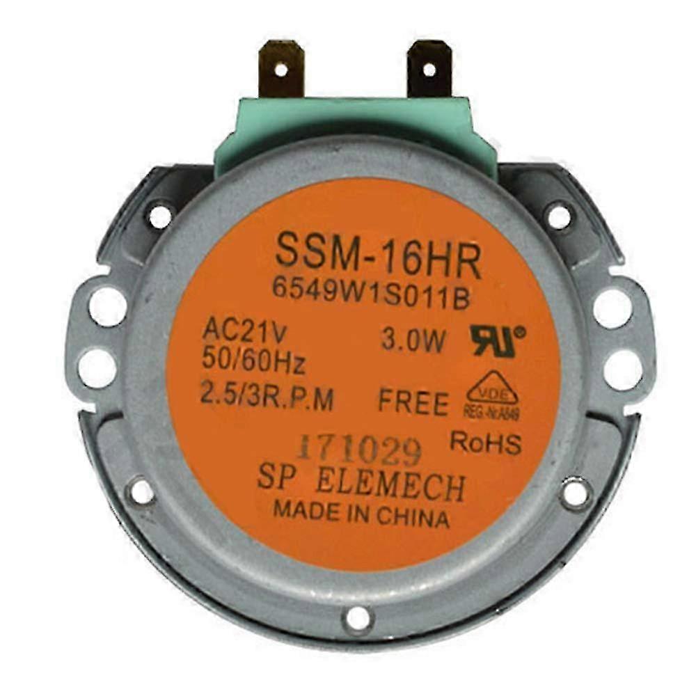 This is a synchronous motor, with 2-pin terminals, d-shaped shaft.Part number: 6549W1S011B. AC21V, 50/60Hz, 3W, 2.5/3R.P.M. Replace your broken, damaged and unusable turntable motor. Replacement for micro oven. Model Number: SSM-16HR Part Number: 6549W1S011B Voltage: AC21V Frequency: 50/60Hz Power: 3W Speed: 2.5/3R.P.M Hole Distance: 56mm / 2.2in, 54mm / 2.13in Package Weight: 75g / 2.65ounces Package Size: 60 * 60 * 20mm / 2.36 * 2.36 * 0.79in Packing List:1 * Turntable Motor