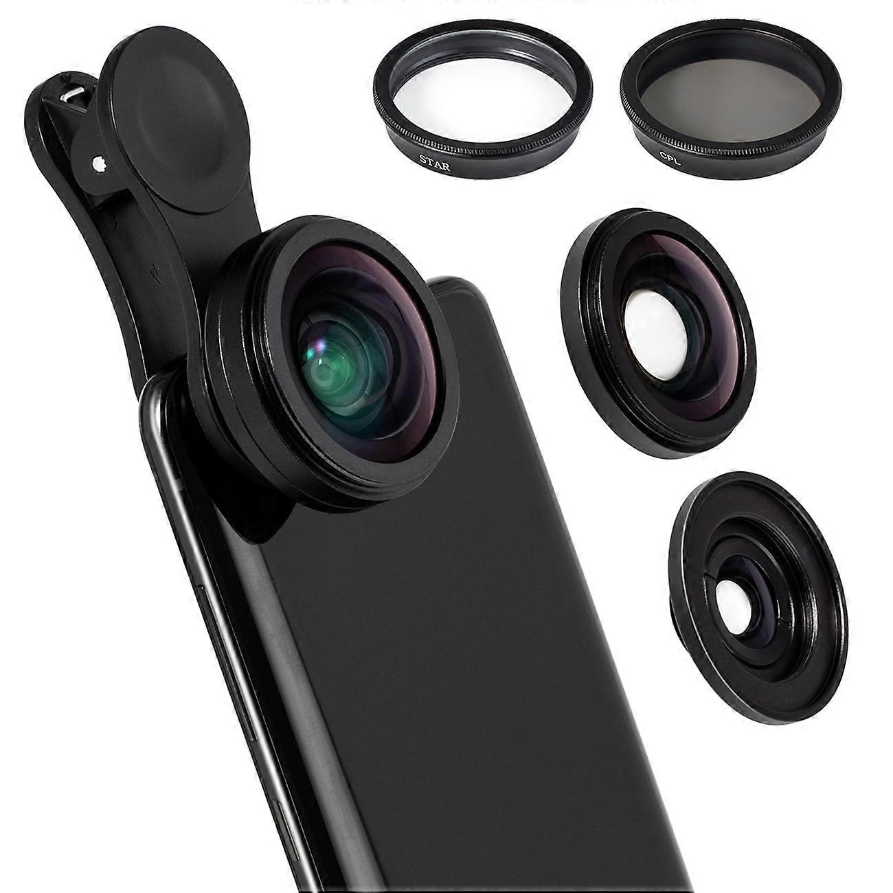 4-in-1 Phone Camera Lens Kit: 0.6X Wide, 15X Macro, Star & CPL Lens, compatible with iPhone 12/10/8/7/6/6s Plus/X/XS/XR, Android, Samsung