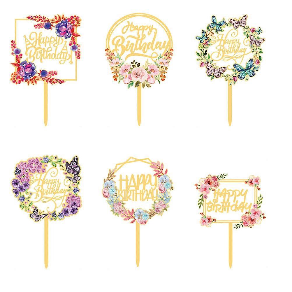 6pcs Acrylic Cake Inserts Butterflies Flowers Happy Birthday Cake Insertion Topper