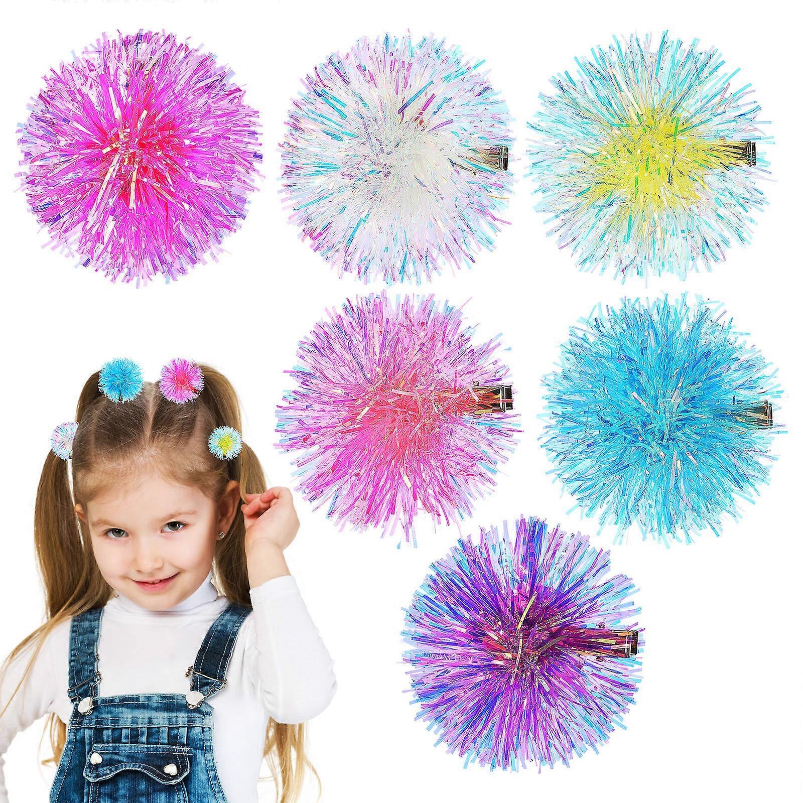 a refined and engaging product description based on your input: **6pcs Colorful Pompom Hair Clips with Foil Strips – Fluffy & Stylish Hair