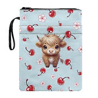 Étui de transport pour livre en polyester avec poche et fermeture éclair, réutilisable, motif vache des Highlands et cerises.