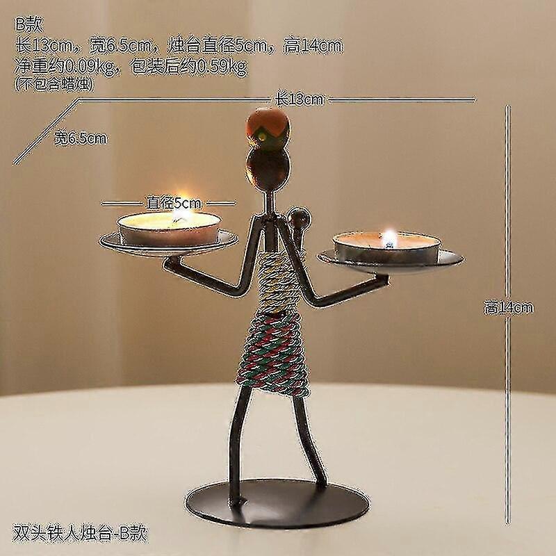 A. Chinese-style iron candlestick handicrafts for table decoration of candlelit dinners. Vintage-style candlesticks, candle holders, and lamp bases. B. Material: Creative iron candlesticks, home decorations, small ornaments for the table of candlelit dinners. European minimalist-style small candlestick decorations with ethnic style, having a design and concept. The bottom of the candlestick is hand-woven with ethnic characteristics. C. Color: Please refer to the picture. D. Dimensions (length, width, height): - Iron candlestick A: 6.5×6.5×13 cm - Iron candlestick B: 13×6.5×14 cm - Iron candlestick C: 2.5×6.5×12.5 cm - Iron candlestick E: 10×6.5×15 cm