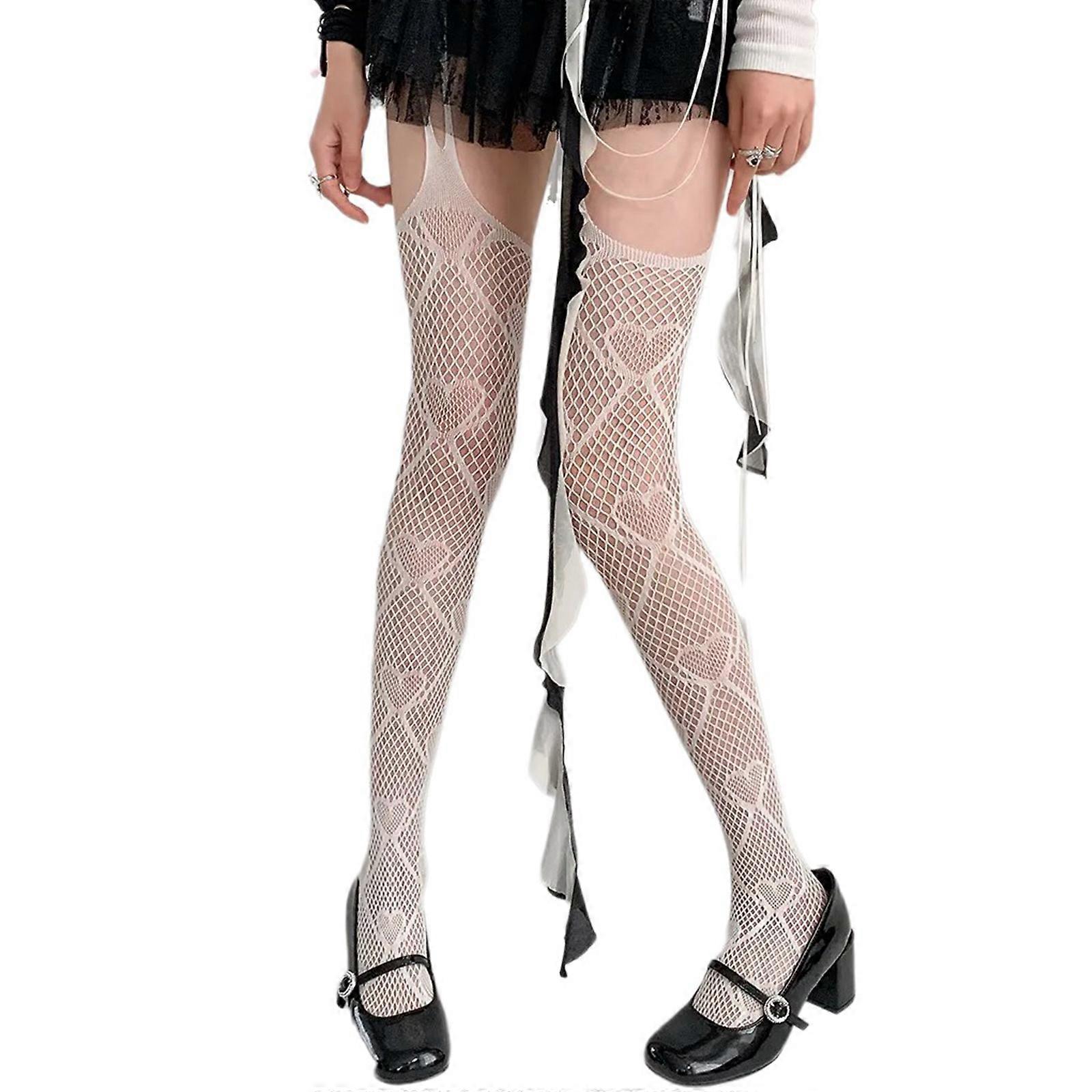 Women Sexy Hollow Out Fishnet Garter Belt Pantyhose Gothic Heart Patterned Sheer Thigh Highs Stockings Suspender Tights Milky white