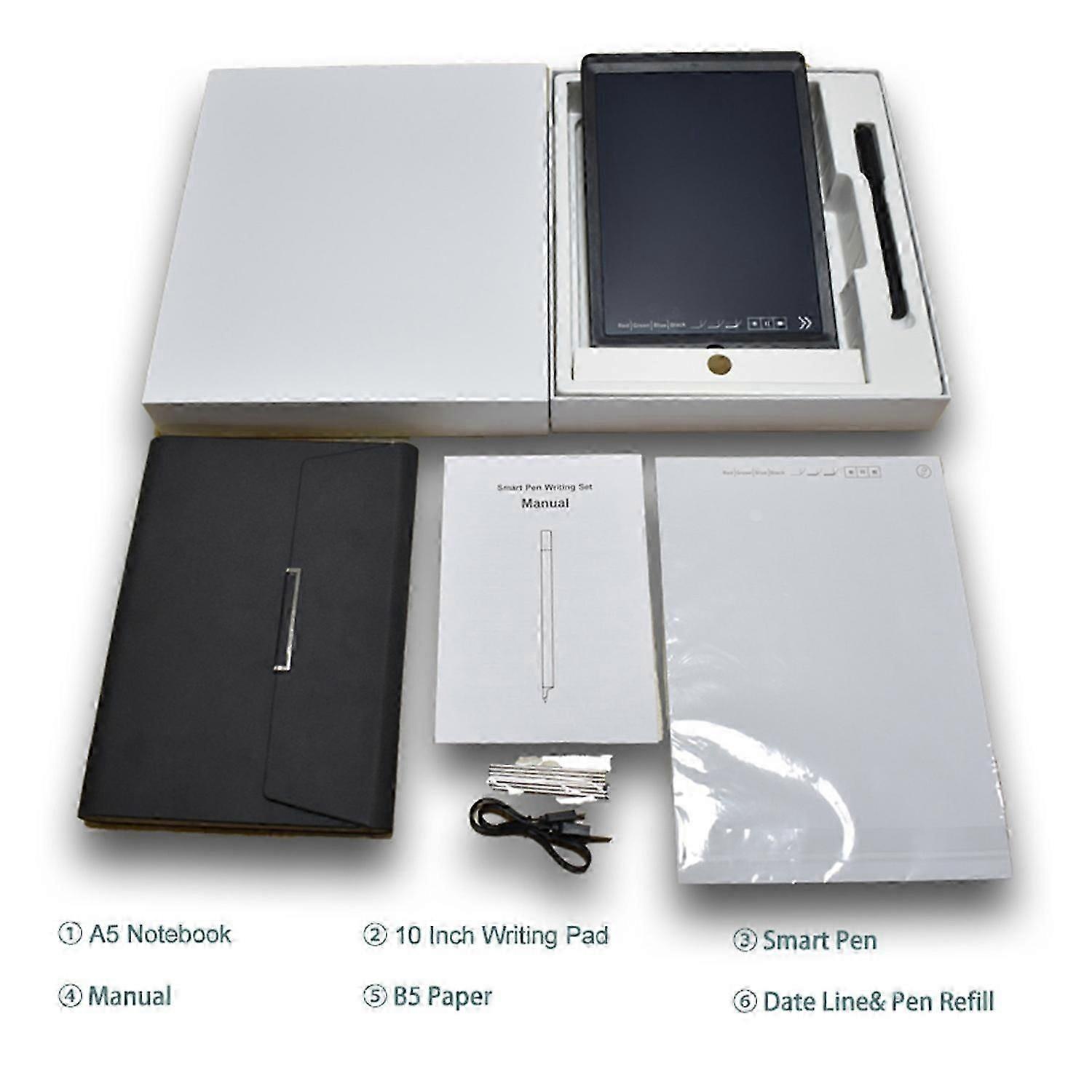Feature:Specification:Model: SP01Connection: BT5.0System: Android 5.0 and above, iOS 9.0 and aboveHandwriting resolution accuracy: 1/600 inchFocal length: no fixed valueImage frame rate: 80HZWriting speed: 20cm/SecWriting angle: 360 degreesIndicator light: blue and red dual-color indicator lightBuilt-in lithium battery: rechargeable polymer lithium battery 3.7V, 250mAhCharging power supply: DC 5.0VCharging time: about 2 hoursUsage time: about 8 hoursDigital pen size: 164mm (including pen cap)10-inch smart dot matrix boardSize: 264 x174mmColor: blackThickness: 4.5mmWeight: 186gA5 dot matrix code bookSize: 227 x 146mmCover: PU leatherPaper: 100g off-white Dalin paperPackage List:1 x Digital Pen1 x A5 PU Notebook1 x 10inch Writing Pad1 x Data Cable20 x B5 Paper1 x User Manual3 x Ballpoint Pen Refill2 x Plastic Pen Refill