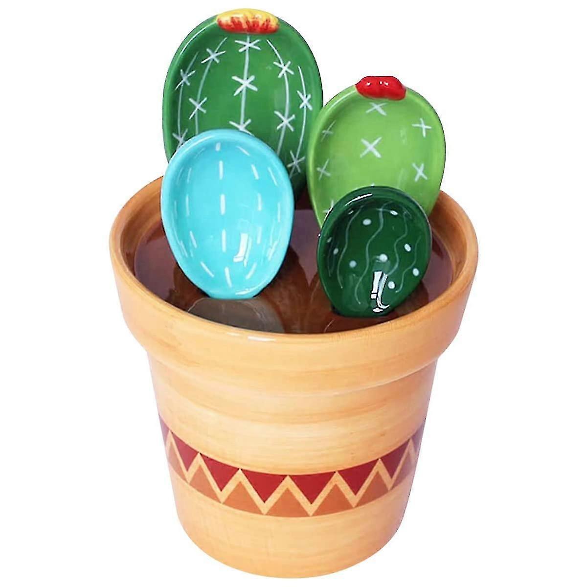 4Pcs Porcelain Measuring Spoons Set with Base Cute Cactus Shape Stirring Soup Spoon Reusable and Durable Ceramic Flower Pot Measuring Spoon Set for Ho