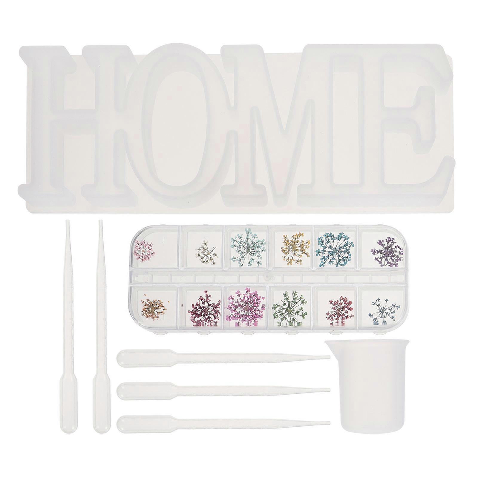 This set of item is a perfect choice for DIY handmade lovers or those who are just new to handicraft making. Practical and unique, professional and accurate. You can use the molds to create beautiful "home" shaped crafts with friends. Reusable mold is choice for professional or practice use. Easy to mold and demold. Features -Color:Assorted Color -Material: Silicone -Size: Approx. 23.3 x 8.8 x 2.2 cm / 9.16 x 3.46 x 0.86 inch - Silicone materials are durable and safe, could keep it for a long time. - With many operating tools such as measuring cup and droppers, help you make them more easily. - With a box of dried flower, you can make unique and beautiful handmade crafts with them. - Featuring word "home" shaped design, perfect for DIY unique crafts with your imagination, for Christmas party, banquet, family gathering, or just daily use. - Use molds to make your DIY crafts and experience the fun of hands-on. Package list: 1 x Silicone Mold 1 x Measuring Cup 5 x Droppers 1 of Dried Flower