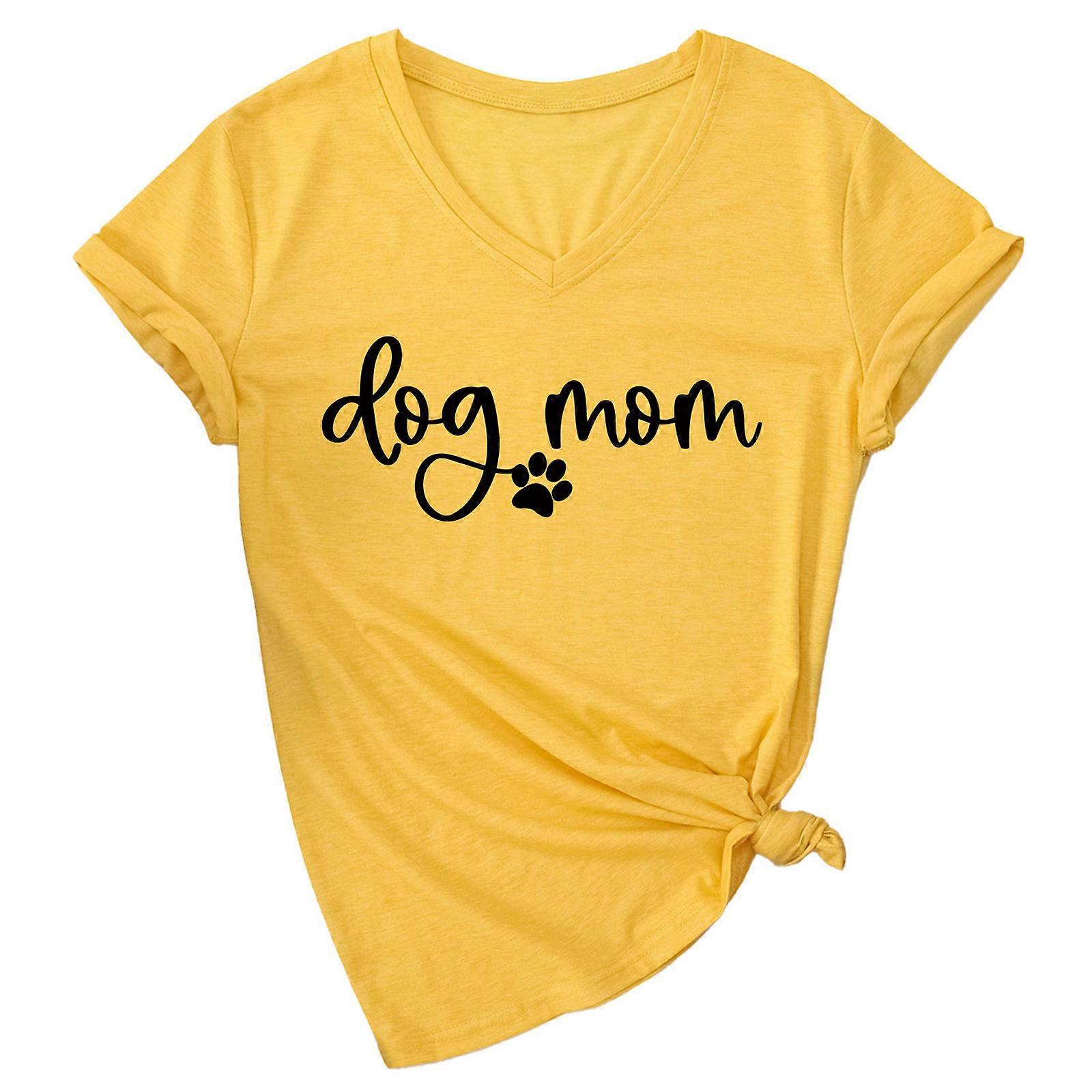 Womens Casual Loose T-Shirts Short Sleeve V-Neck Dog Mom Letter Printed Dog Paw Cute Graphics Pullover Tee Top Blouses Yellow XL