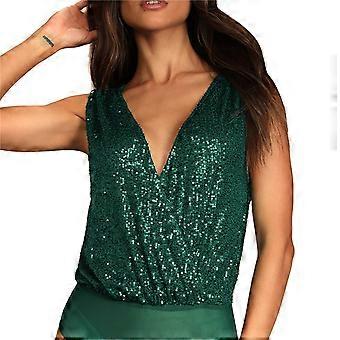 Femmes Col V Body Top Brillant Sequin Décolleté Dos Sans Manches Débardeur avec Slip en Maille Vert S
