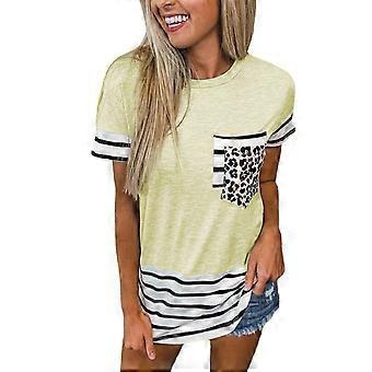 Womens Summer Short Sleeve Loose Fit Striped T-Shirt Colorblock Leopard-Print Pocket Patchwork Casual Blouses Tunic Top Yellow XL