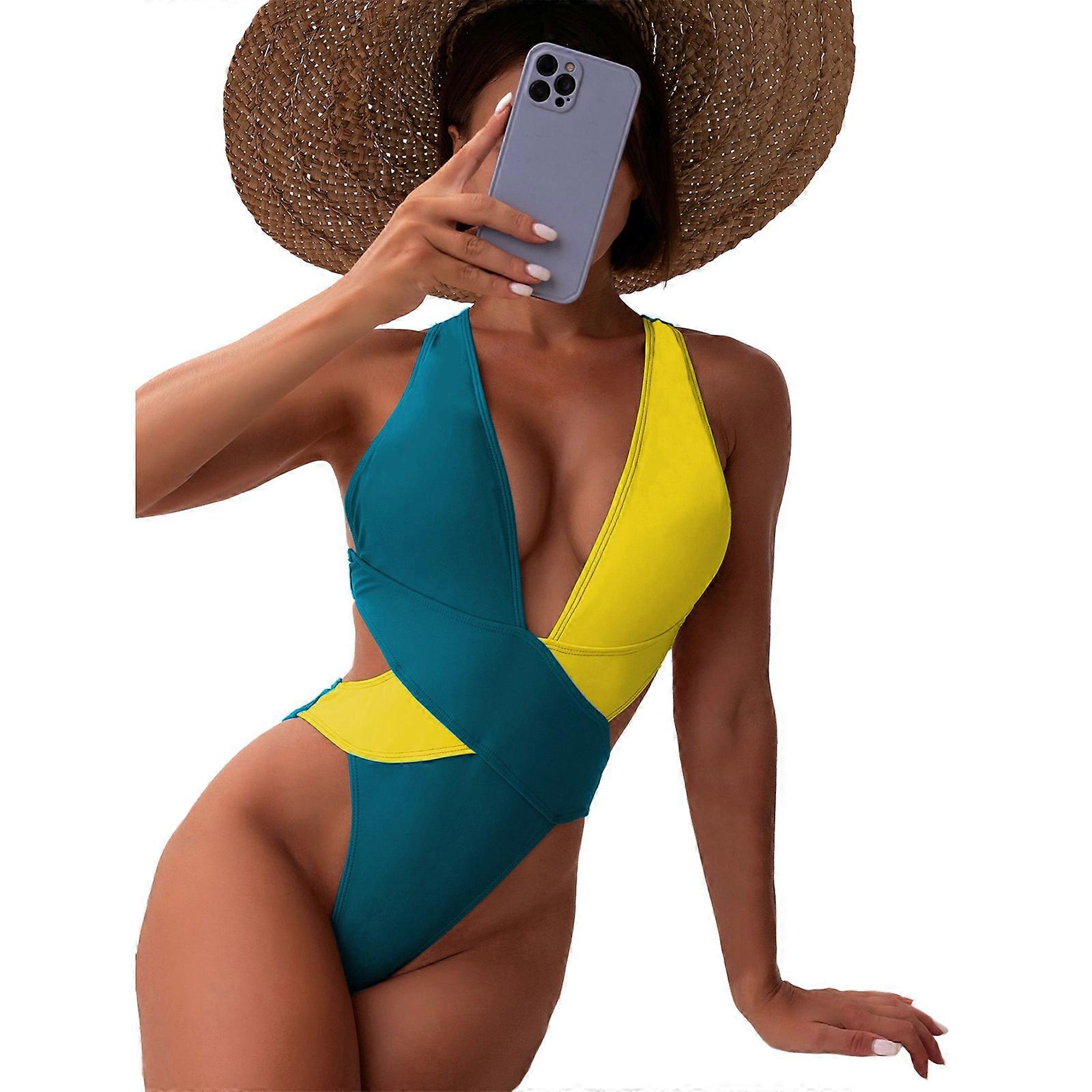 Women Wide Straps Bikinis Sexy One-piece Swimsuit Push Up Swimwear Beautiful Back Bikinis Beachwear Hollow Bathing Suits blue yellow S