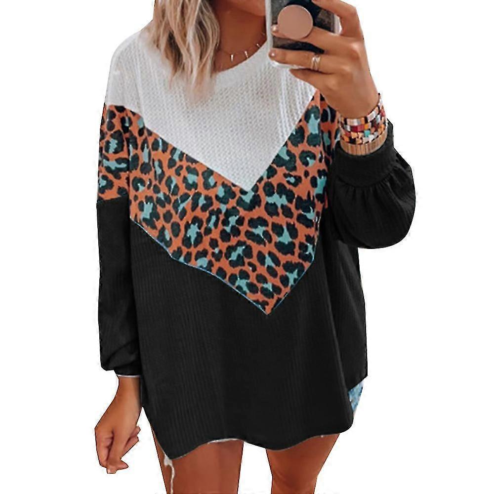 Women Leopard Patchwork Long Sleeve Knitted Sweater Loose Casual Pullover Jumper Top