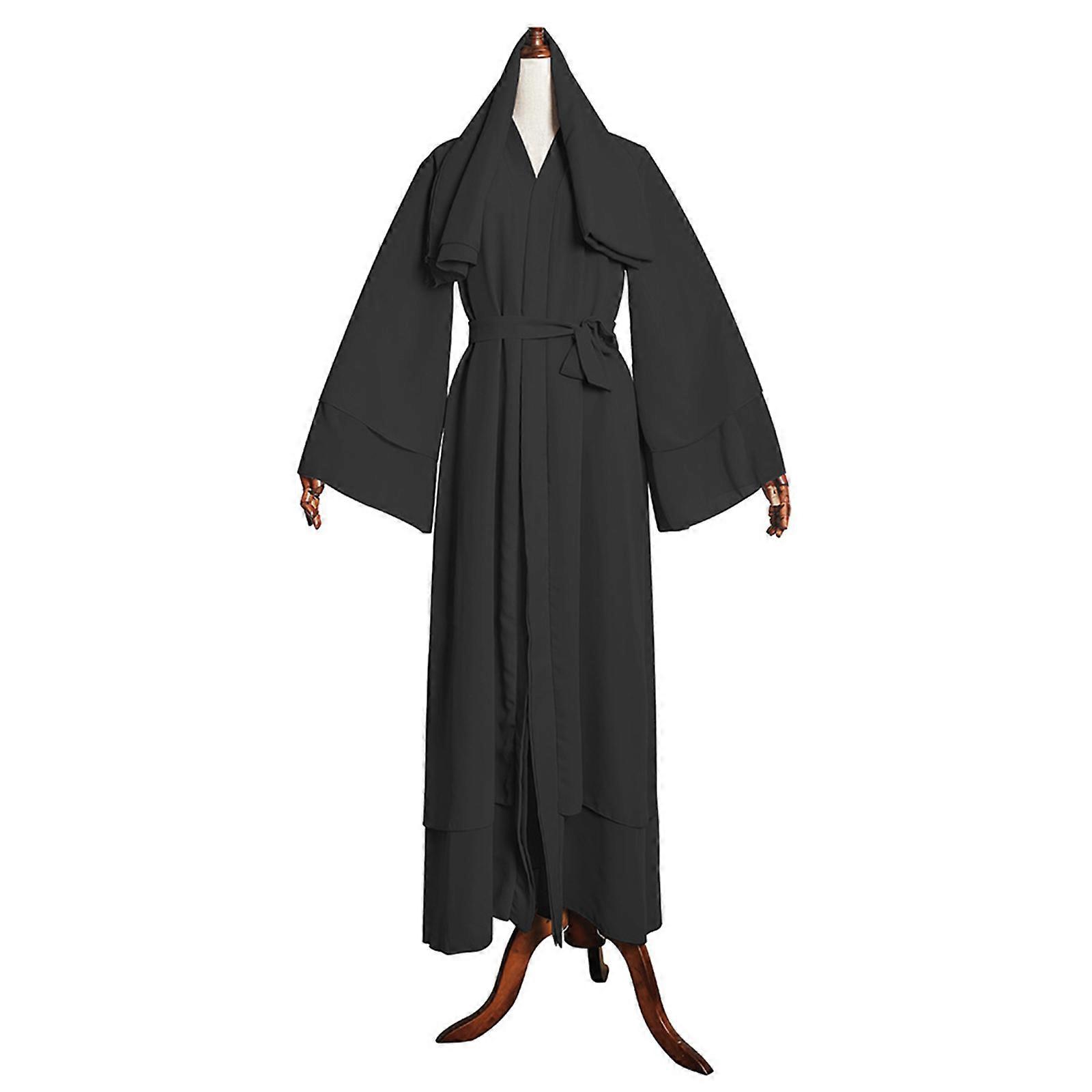 Women Muslim Flare Sleeve Flowy Maxi Dress Solid Color Open Front Cardigan Robe Black XL