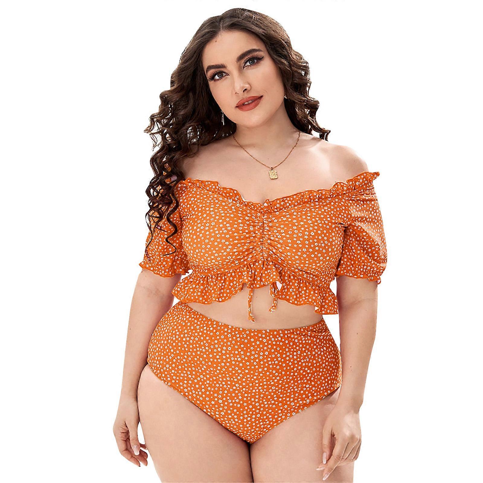 Womens Sexy Ruffle Off Shoulder Drawstring Front High Waisted Bikini Set Push Up Floral Printed Swimsuits Bathing Suit Orange XL