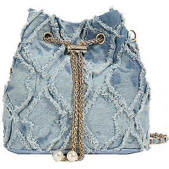 Sac seau en jean matelassé à cordon coulissant (bleu), idéal pour femme, avec pochette, sac hobo et sac bandoulière.