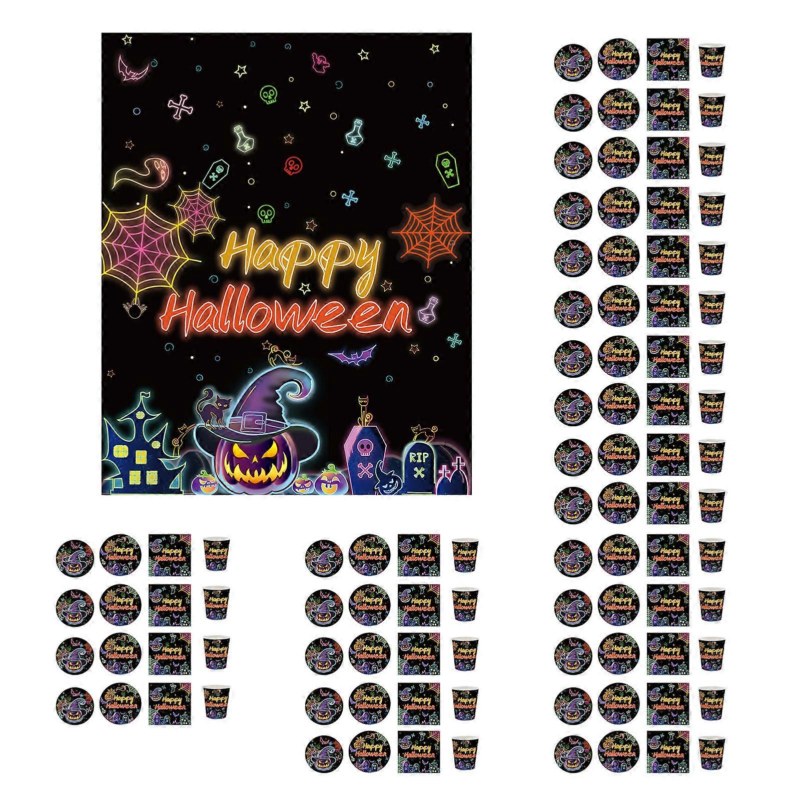 Halloween Disposable Tableware Kit Plates Napkins Tablecloth Cups Set Castle Bat Pumpkin Ghosts Halloween Theme Tableware Party Supplies Qinghai