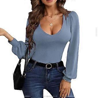 Femmes V Col Plissé Chemisier Ample Coupe Lanterne À Manches Longues Plaine Couleur Casual Pull Top