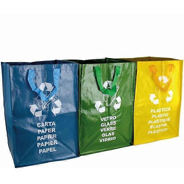 This set of 3 recycling bags is perfect for helping you sort your waste and making it easier for you to recycle plastic (yellow bin), glass (green bin), and paper/cardboard (blue bin). Made from polypropylene, each bag is very durable. Thanks to cross-stitching, the handles are resistant to the bag's weight. These recycling bags are therefore strong and durable, designed to last. Thanks to a velcro strap on each bag, the bags attach to each other, perfect for optimal storage. When you want to empty a bag, it's as simple as detaching it and carrying it using the handles. Each of these 3 recycling bags measures 43.5 cm in height, 32 cm in width, and 35 cm in depth. The capacity of the 3 bags combined is 130 L. To clean the bags, simply wipe them with a sponge.