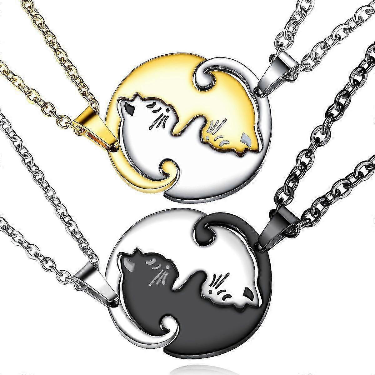 This titanium steel pendant necklace features a pair of adorable cats hugging, making it a unique and meaningful gift. The high-quality titanium steel construction ensures durability and long-lasting wear. The intricate details of the hugging cats design create a realistic and charming look. The necklace comes with an adjustable chain to fit any neck size and can be worn with any outfit. This necklace makes a perfect gift for cat lovers or as a symbol of friendship and love. Description: Add a touch of cuteness and love to your outfit with this adorable hugging cats pendant necklace. Made with high-quality titanium steel, this necklace is durable and long-lasting, ensuring that you can enjoy wearing it for years to come. The intricate details of the hugging cats design create a realistic and charming look, making it a unique and meaningful gift for yourself or someone special. The necklace comes with an adjustable chain to fit any neck size, and can be worn with any outfit to add a touch of whimsy and fun. This hugging cats pendant necklace is a perfect gift for cat lovers, or as a symbol of friendship and love. Its cute and charming design is sure to brighten anyone's day and bring a smile to their face. With its high-quality materials and unique design, this hugging cats pendant necklace is sure to become a cherished piece in your jewelry collection. Order now and add some cuteness and love to your everyday look. Weight: 24g Color: a pair of black and white kittens, a pair of golden steel kittens Material: titanium steel Quantity: 2pcs personalized splicing pair of kitten hugging necklaces