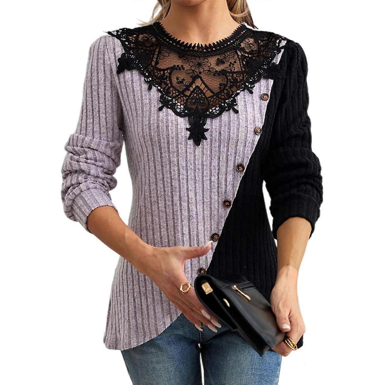 Women's Color Block Ribbed Tunic Sweaters with Lace Neckline Long Sleeve Tops Early Fall Fashion Knit Tops Purple XL