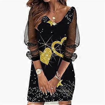 Women\'s Dress Sequins See-through Mesh Long-sleeved V-neck Short Dresses