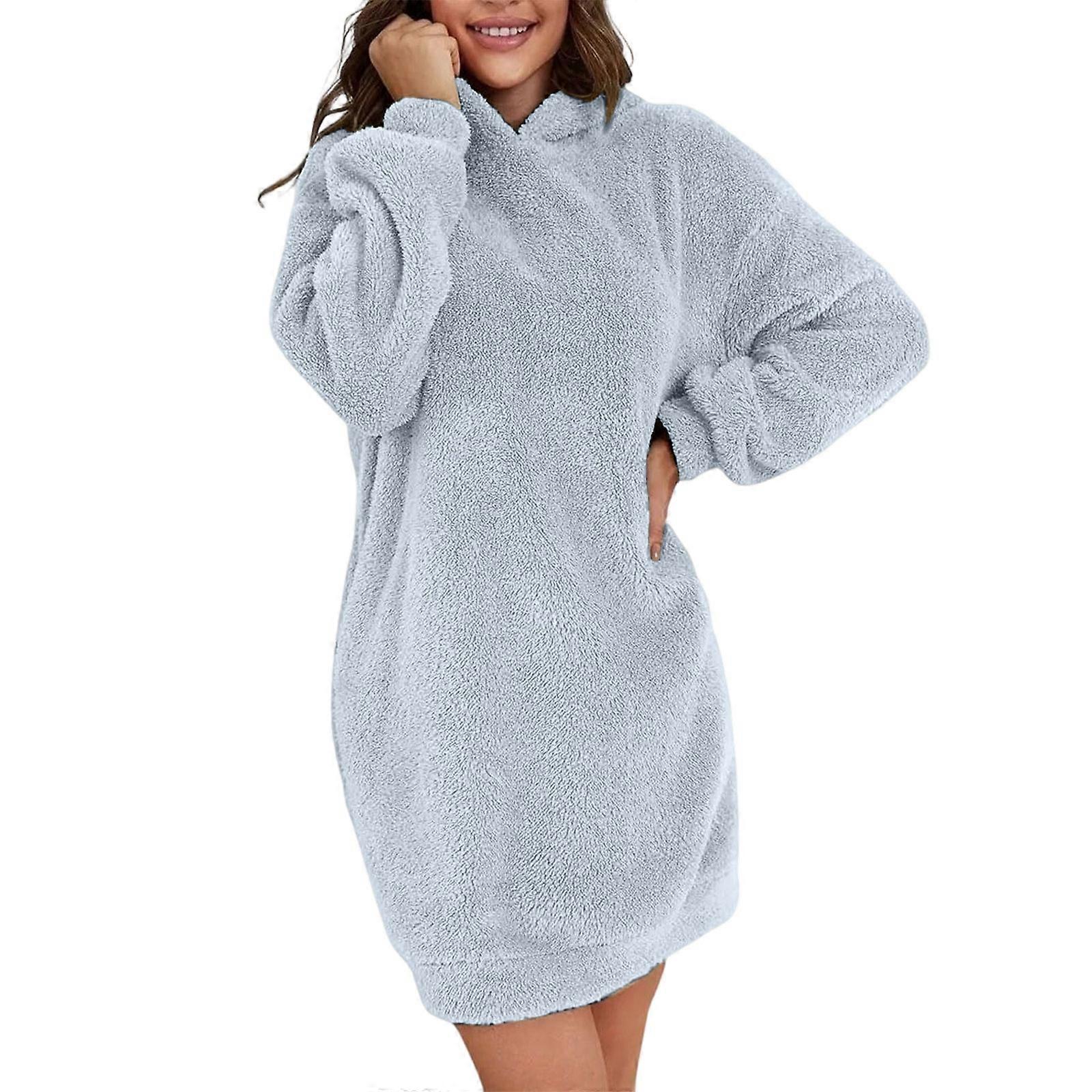 Women Long Fuzzy Sweatshirt Hooded Warm Plush Fleece Tunic Pullover Dress Sky Blue XL