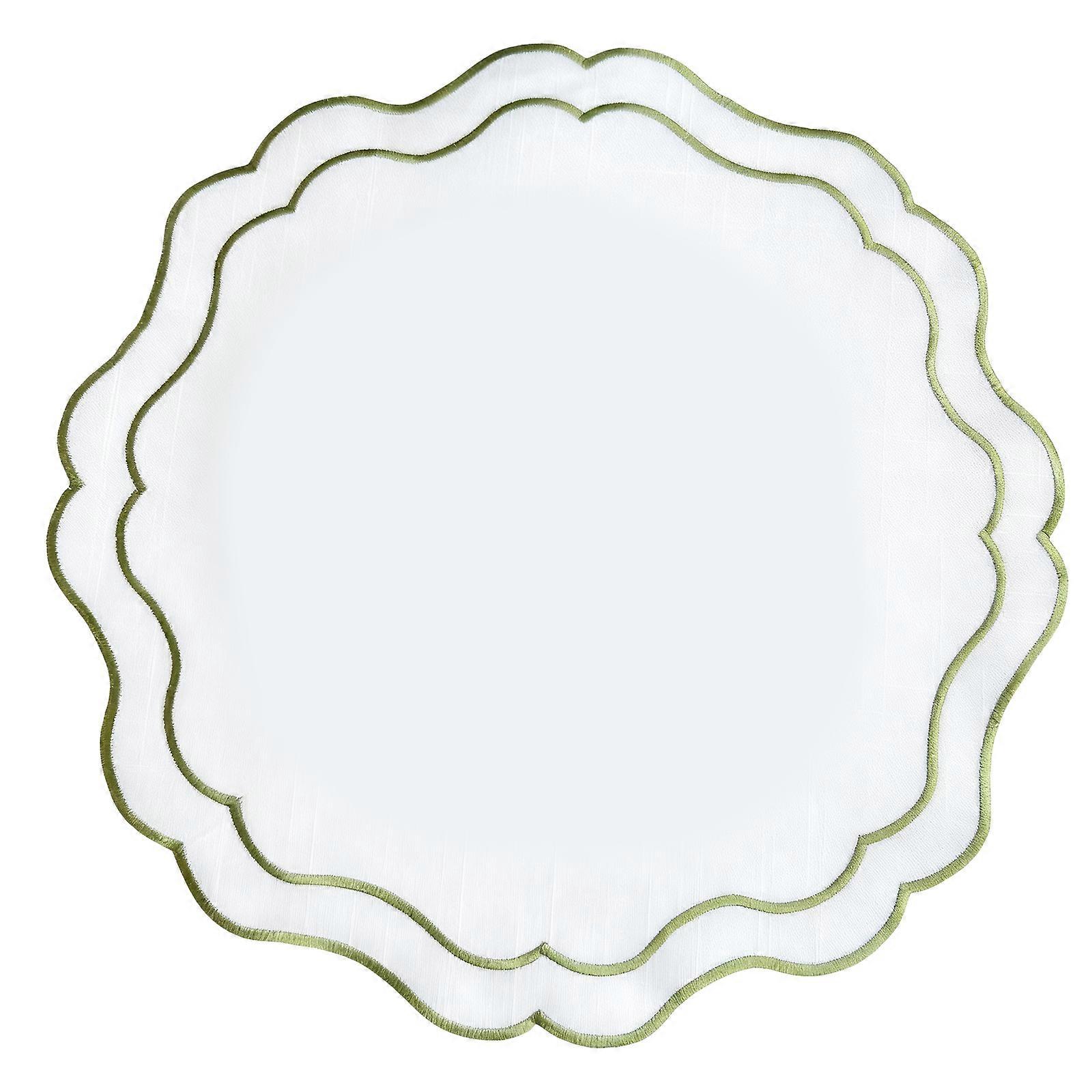 Flower Embroidery Round Placemat Washable Polyester Fabric Table Mat Scalloped Edges Design For Dining Party Decors Green