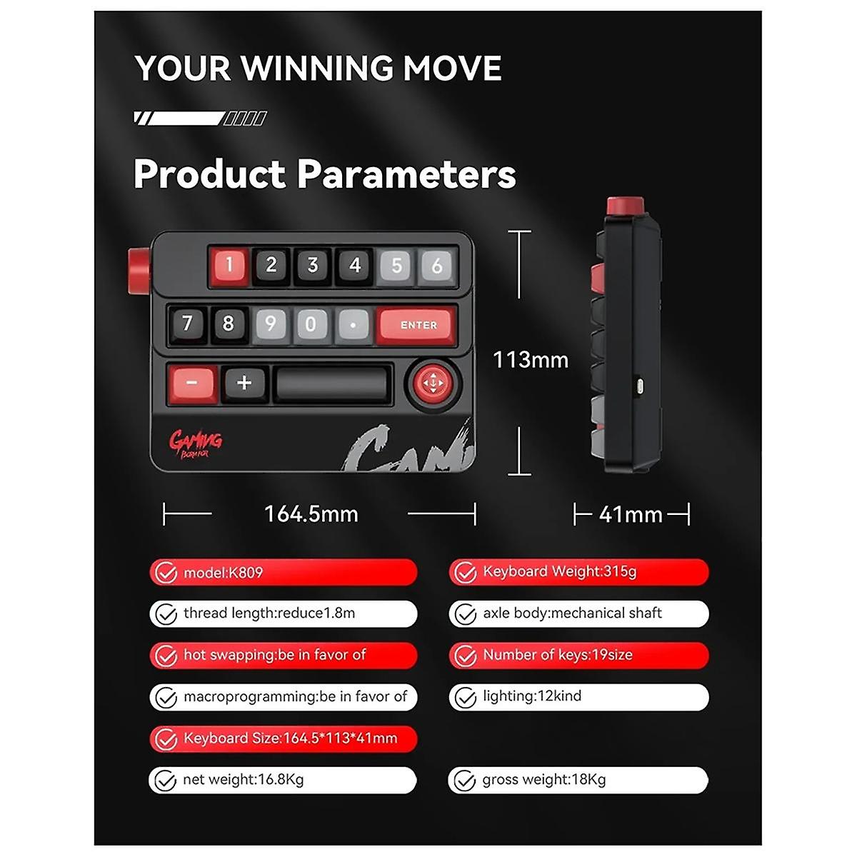Model: K809 Line length: approximately 1.8m Axis body: mechanical axis body Hot swappable: supported Number of buttons: 19 Macro programming: support Lighting: 12 types Rocker knob design Full key no impact RGB illusion lighting effect Colour:C:Black Material:ABS Package Contents: 1x Wired mechanical gaming keyboard Only the above package content, other products are not included. Note: Light reflection and different displays may cause the color of the item in the picture a little different from the real thing. The measurement allowed error is +/- 1-3cm.