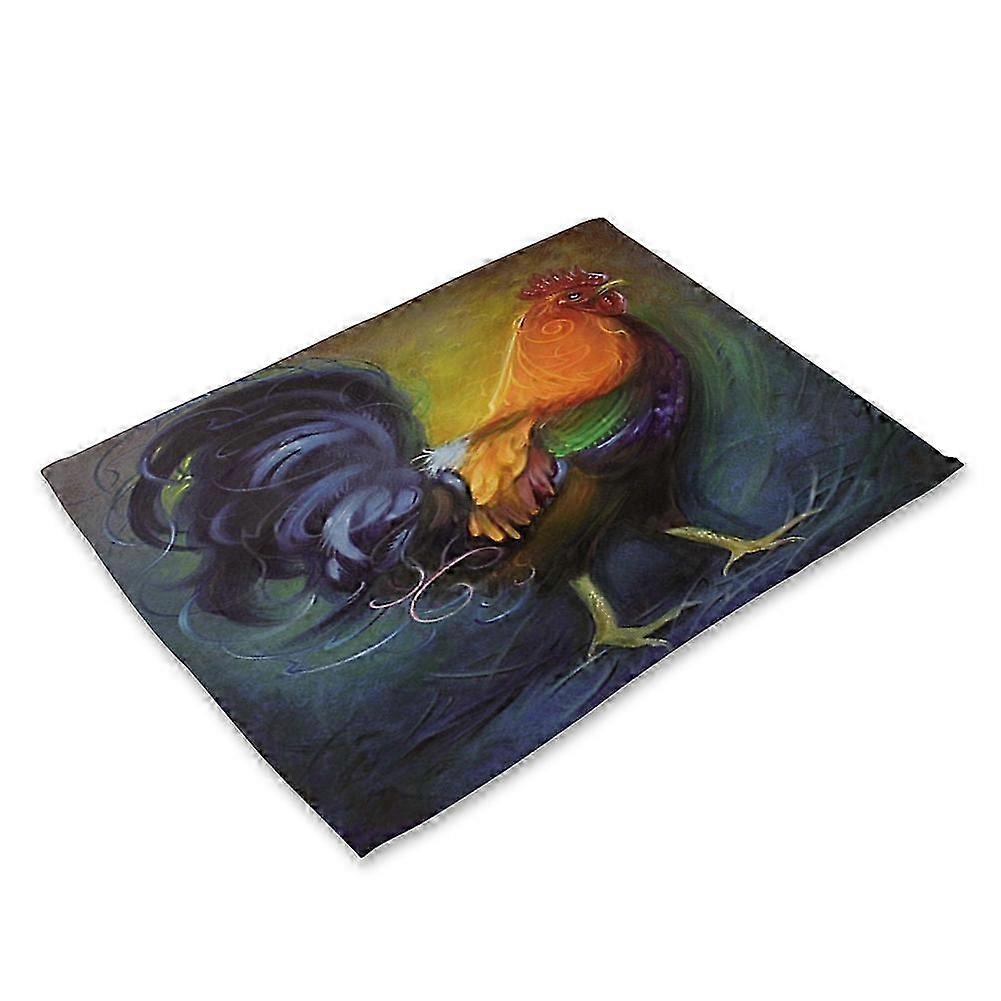 Painted Cock Design Non-Slip Heat-Resistant Table Placement Mat with Bowl Plate and Fork for Dining Use