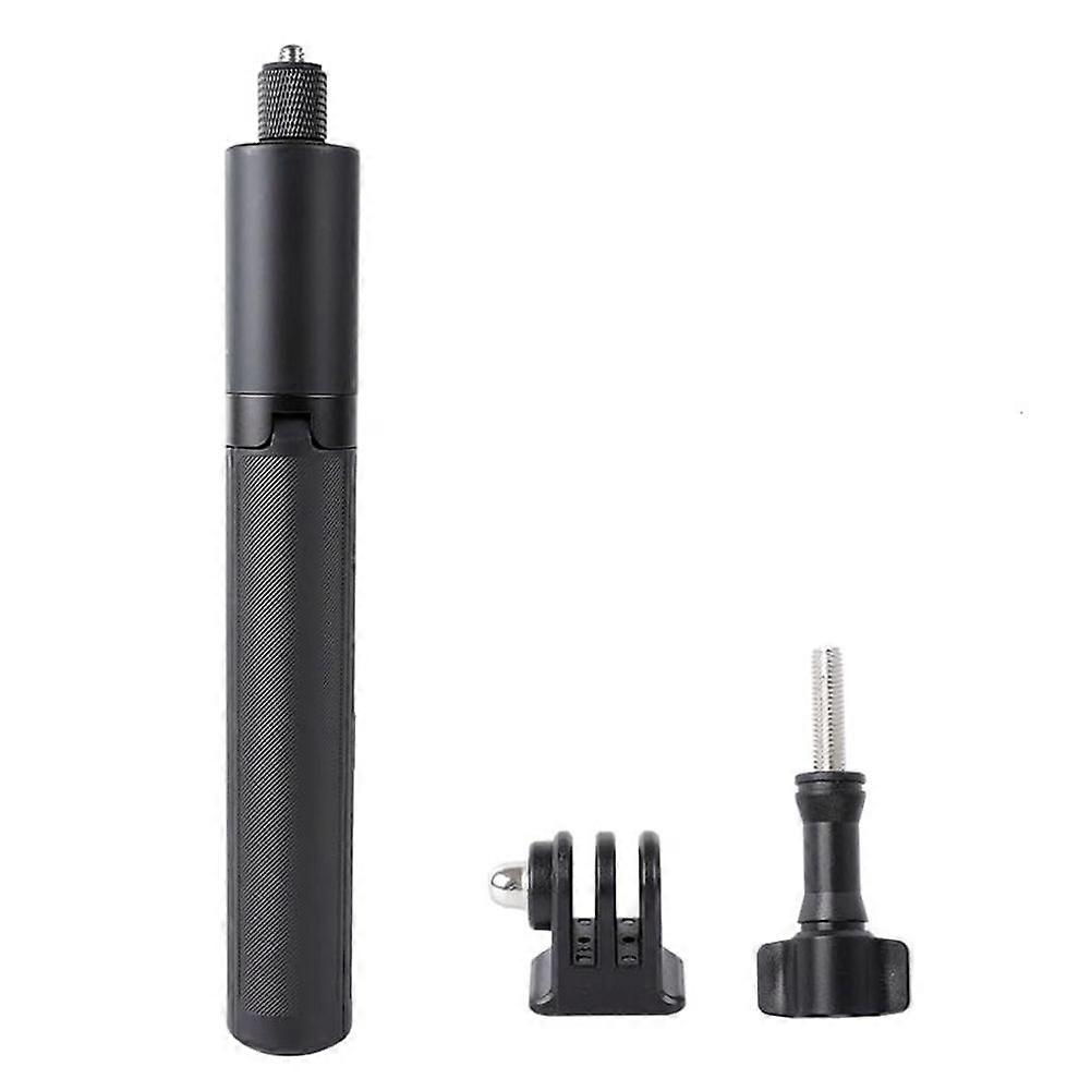 Integrated design of tripod and selfie stick. It is both a selfie stick and a tripod, and this design integrates the selfie stick and tripod functions, allowing for free switching between extended stick and tripod modes. The storage length is only 9.64 inches, and the weight light, easy to carry. Easy to operate, with 7 metal tubes that can be stretched for extended use. 1/4 inch interface, compatible with most standard 1/4 accessories, equipped with for adapter and screws. Gently press the bottom PUSH button to open the tripod, simple and easy. The tripod has rubbers pad at the bottom to maintain stability. The handle has a non slip feeling. Compatible with: for Hero 12 11 10 9 8 7 6 5 Session MAX for Action 4 3 2 for One x2 x3 go3 R and other action cameras. Colour:Black Material:Aluminum alloy + plastic Package Contents: 1 x Selfie Stick 2 x Adapter Only the above package content, other products are not included. Note: Light reflection and different displays may cause the color of the item in the picture a little different from the real thing. The measurement allowed error is +/- 1-3cm.